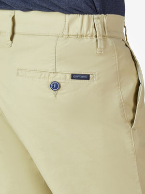 Nahaufnahme eines beige Hosenbundes mit Gürtelschlaufe, Reißverschluss und sichtbaren Nähten, aus festem Stoff gefertigt.