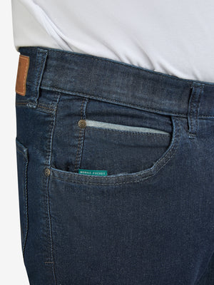 Bequeme 6-Pocket mit elastischem Doppelstoffbund und Hemdstopper. Der Clou: In der rechten Vordertasche ist eine separate "Mobile Pocket" eingearbeitet, in der man sein Smartphone kratzsicher und schnell griffbereit unterbringen kann. Die Münztasche mit Kontrast-Patch bringt einen Hauch Sportivität in den Look. Gefertigt aus einem leichten, hoch elastischen Super High Stretch-Denim. Dank einer Beimischung von PBT-High-Tech-Faser ist diese Jeans überdurchschnittlich strapazierfähig. Gewicht: 420 g/lfm Dieses Modell verfügt über eine normale Leibhöhe und ein schlankes Bein bei schmaler Fußweite.