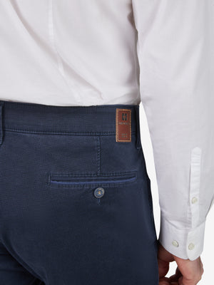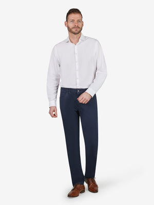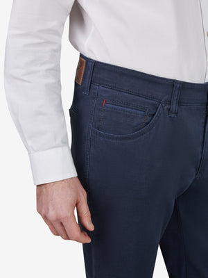 Bequeme Swing-Pocket mit elastischem Comfortbund und Hemdstopper. Die doppelt paspelierte Münztasche bringt einen Hauch Sportivität in den Look. Gefertigt aus einem bi-elastischen Baumwoll-Twill in Mirkostruktur. Gewicht: 405 g/lfm Das Modell verfügt über eine normale Leibhöhe und ein schlankes Bein bei schmaler Fußweite.